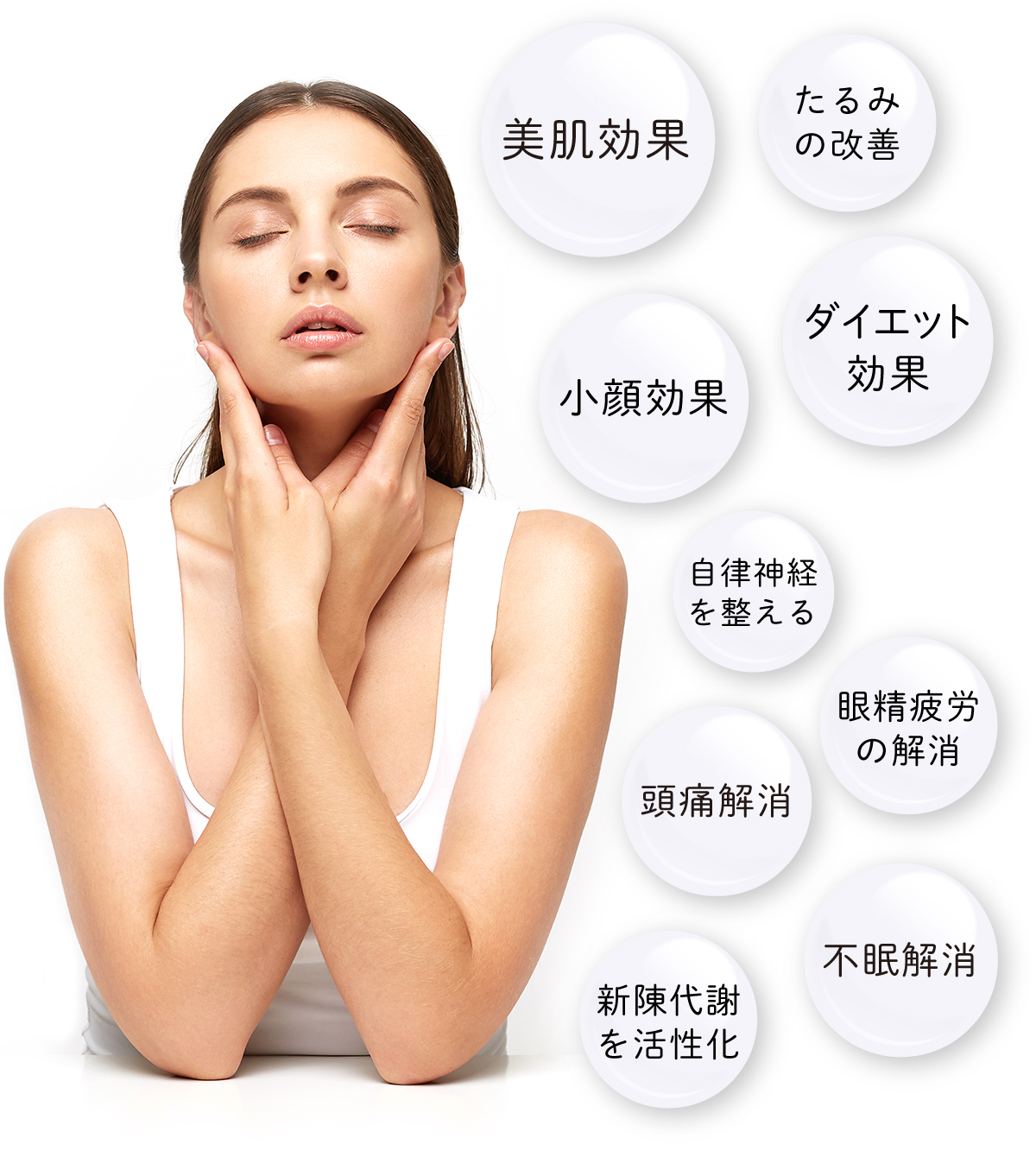 また「コラーゲンの生産」「血流促進」「リフトアップ」「脳の活性化」の4つの効果が期待できます。お肌が生まれ変わるだけでなく、脳の活性化から身体全体の健康づくりも可能です。自律神経も整い、内臓機能の向上により、頭痛、眼精疲労、不眠などを改善することができます。